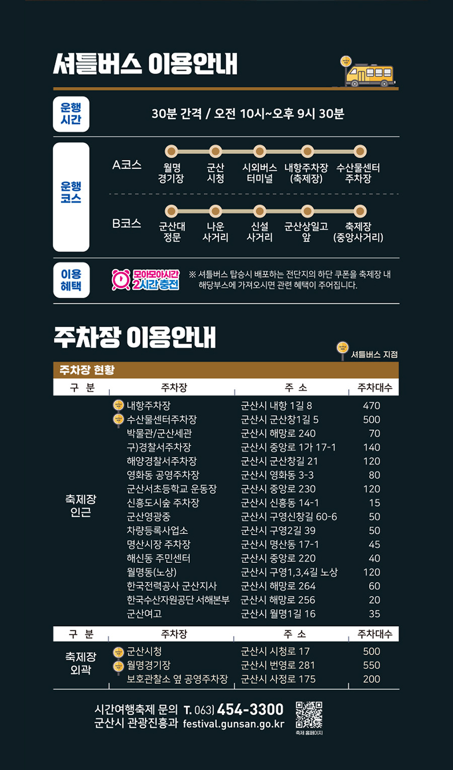 | 셔틀버스 | 월명경기장 ↔ 축제장 / 군산대정문 ↔ 중앙사거리 | 30분 간격 무료 운행 |